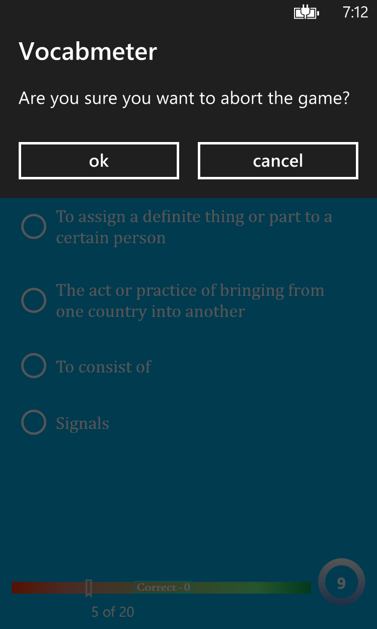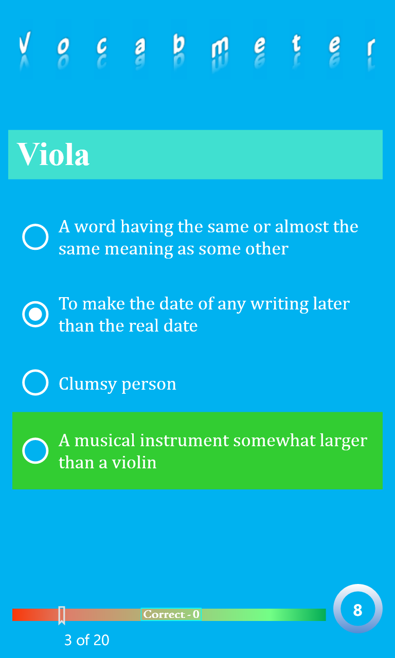 Select the correct meaning for the word in play. After clicking , if wrong meaning is selected then it will turn to red and correct meaning will be highlighted with green. While playing in the Quiz Mode, you will have only a few seconds to select the correct option before the next word appears. As we move along with the game, count at bottom will be updated with correct responses and current word count.