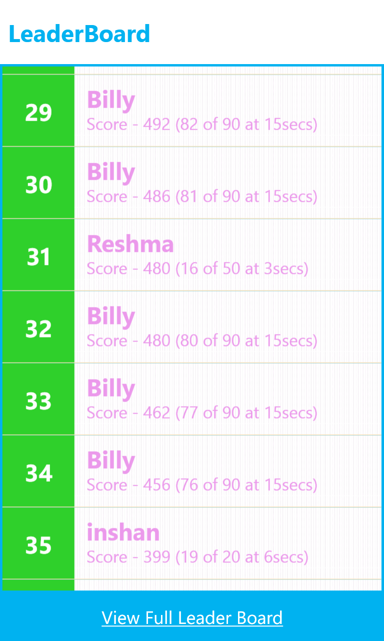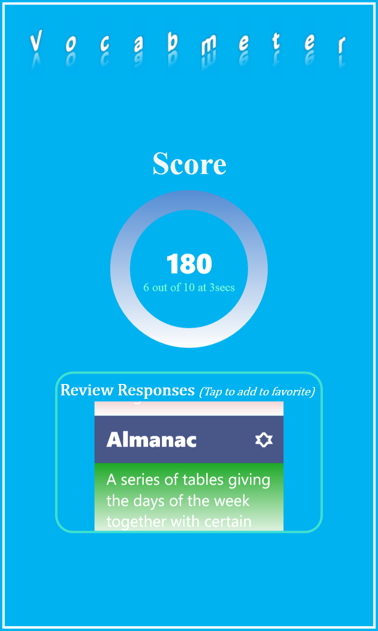 At the end of the game the Score will flash and Leader Board will be updated in Quiz Mode. In case of Study Mode and no internet connection Leader Board will not be updated. This page will give an insight to all the words played in the game. Correct responses are shown in green background whereas incorrect in red. These can be added to Favorite for future review. Clicking on item will add/remove word from Favorite list.