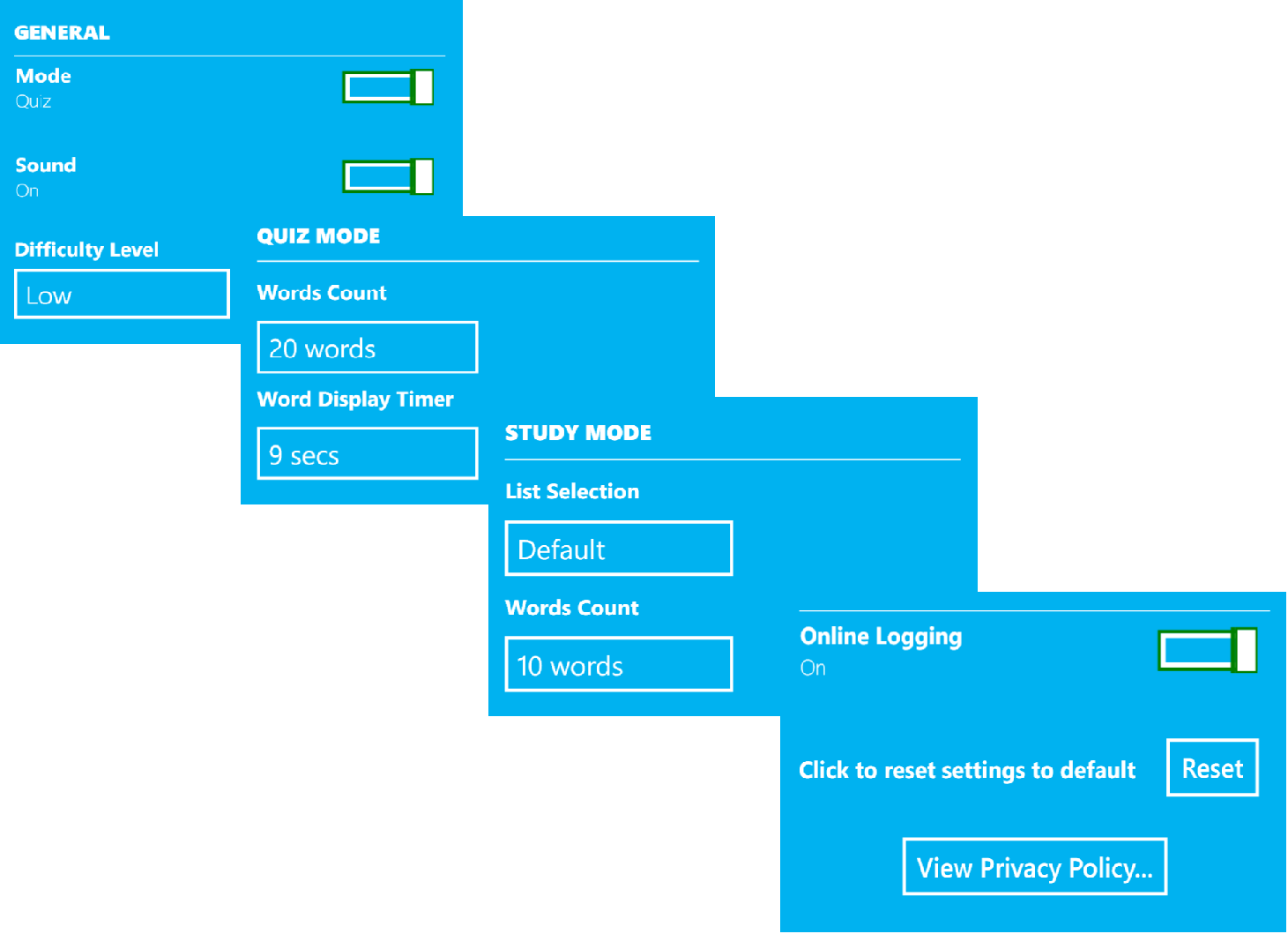 In the Quiz Mode every answer will affect the Score. The Scores will be governed by the Difficulty Level of the Word and the display time set for the word. This mode provides you with the option of controlling the Difficulty Level of the Words presented(which is in the generic settings also available in the Study Mode) and the time for which the word is displayed on your screen by using the Word Display Timer. The number of words in a game is controlled by Words Count Setting.